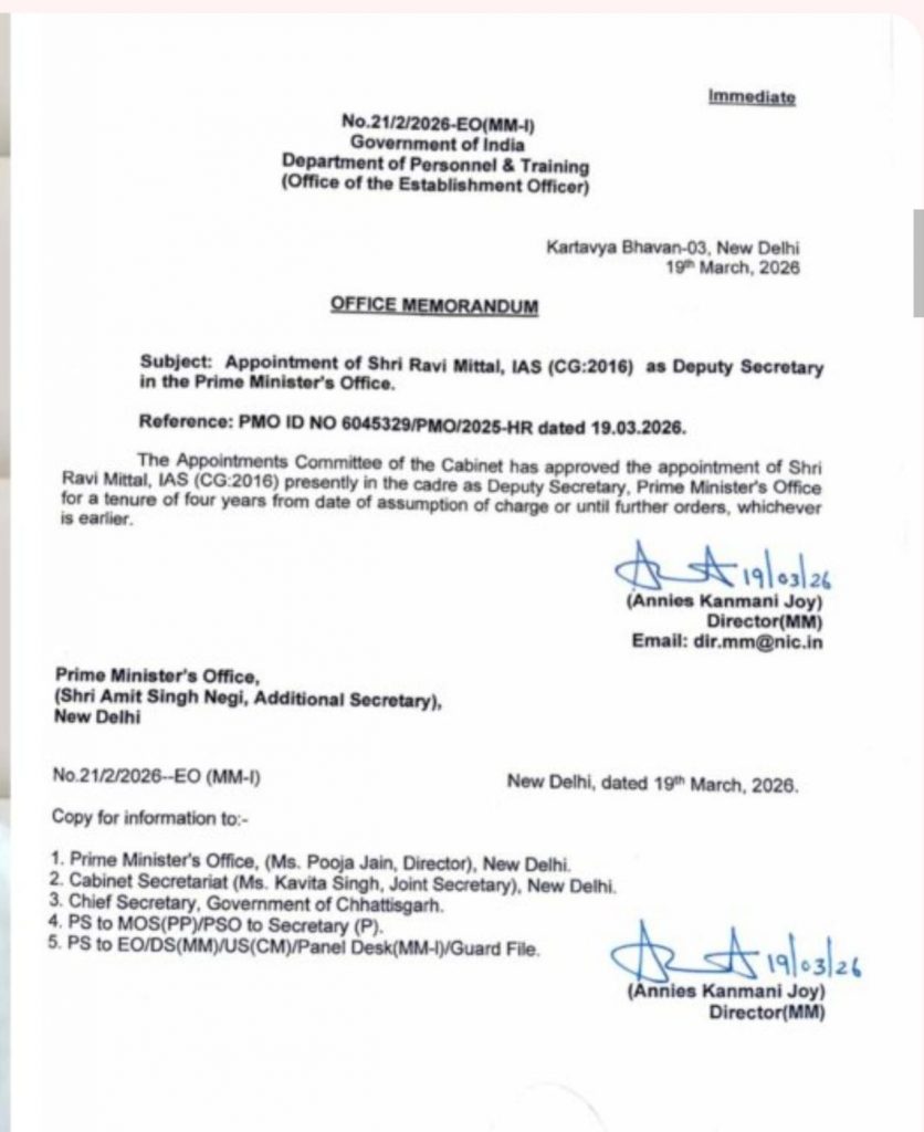 Chhattisgarh: IAS रवि मित्तल को मिली बड़ी जिम्मेदारी, PMO में बनाए गए डिप्टी सेक्रेटरी, आदेश जारी