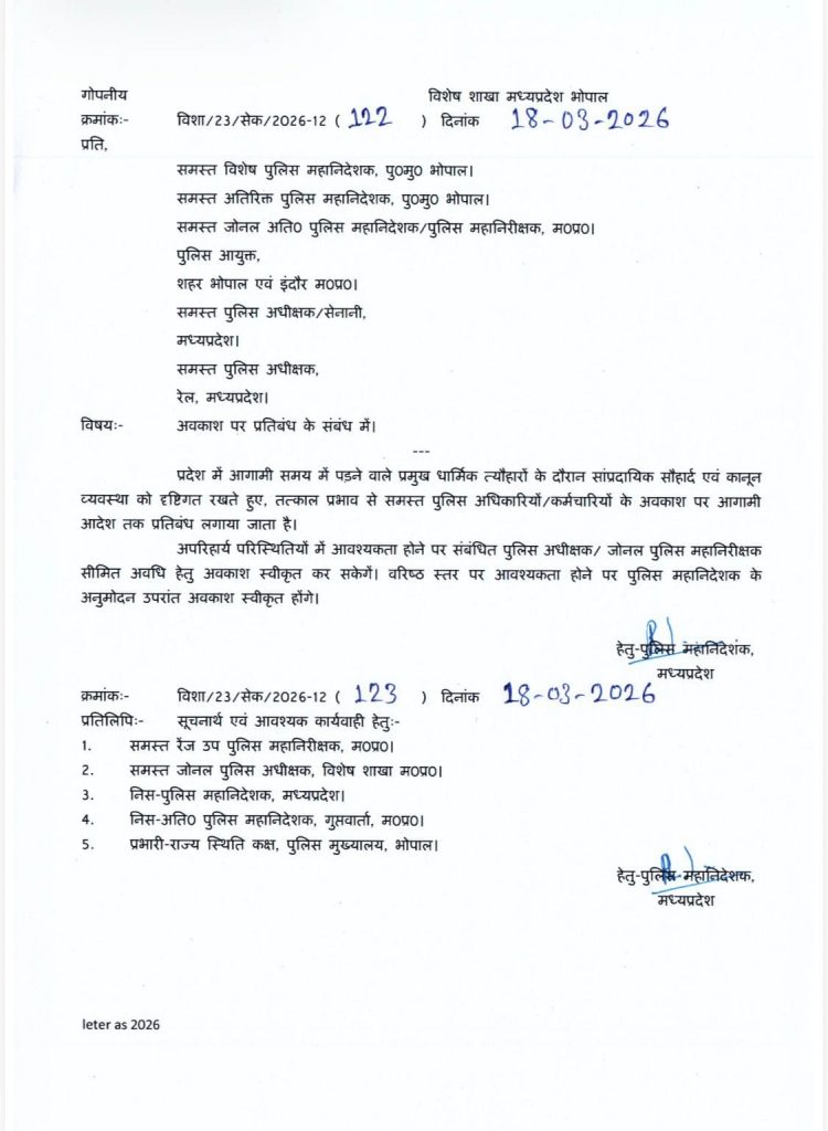 MP News: ईद और रामनवमी पर्व पर पुलिस अधिकारियों की छुट्टी पर लगा प्रतिबंध, जरुरी होने पर परमिशन के बाद ले सकेंगे अवकाश