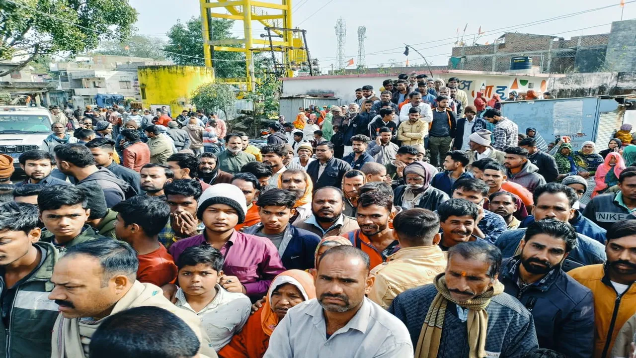 रामनिवास कुमावत और उनकी पत्नी की हत्या के बाद घर के बाहर गांववालों की भीड़ इकट्ठा हो गई है. स्थानीय लोग घटना की जांच को लेकर प्रदर्शन कर रहे हैं.