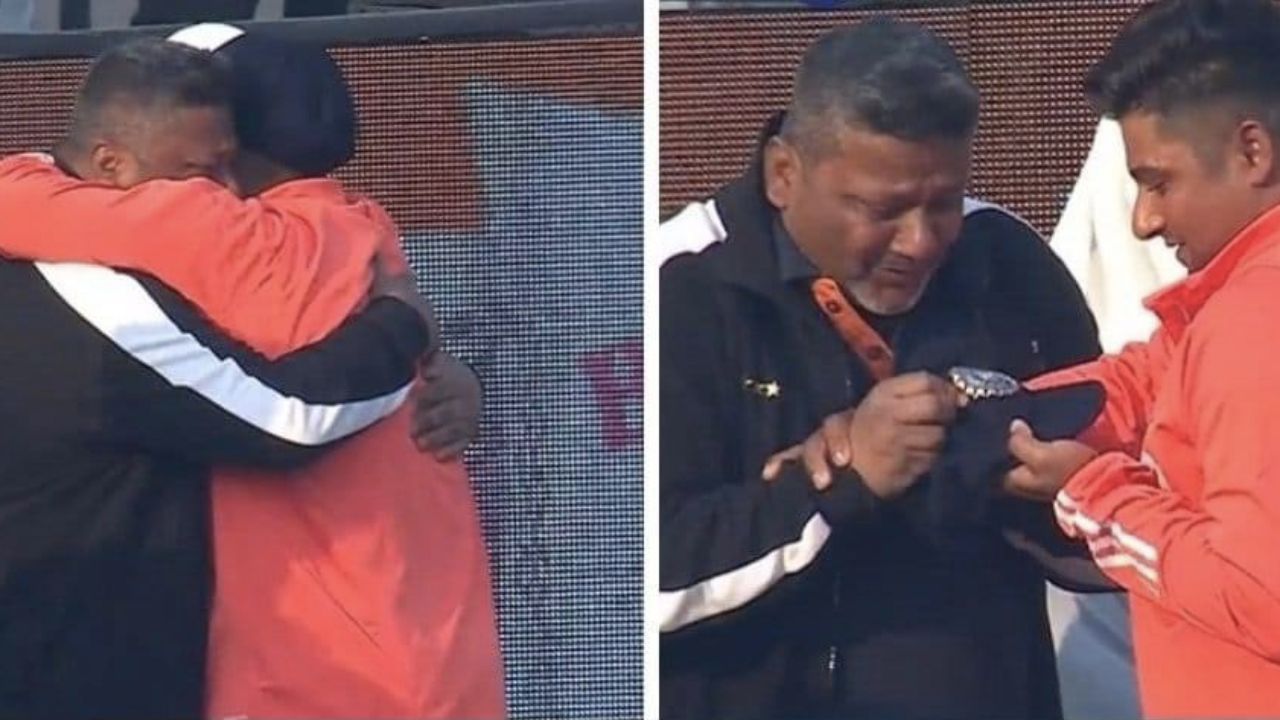 सरफराज कैप को लेकर स्टेडियम में खड़े अपने पिता के पास पहुंचे. तब सरफराज के पिता टीम इंडिया की कैप देखकर अपने आंसू नहीं रोक पाए. वे बेटे के हाथ में टीम इंडिया की कैप देखकर रो पड़े. सरफराज का डोमेस्टिक क्रिकेट में अच्छा रिकॉर्ड रहा है और लगातार उनको टीम में शामिल करने की मांग उठ रही थी. हालांकि अब उनका सपना पूरा हो गया है और राजकोट में वे पहला मुकाबला खेलते नजर आएंगे.